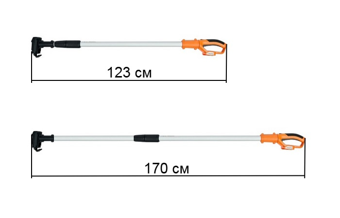 Телескопическая штанга предоставляет возможность заметно увеличить радиус действия аккумуляторной мини-пилы VILLARTEC SA 20M, что во многих случаях позволяет отказаться от применения лестницы или стремянки. Общая длина устройства посредством зажимного фиксатора может быть быстро изменена в пределах от 123 до 170 см.